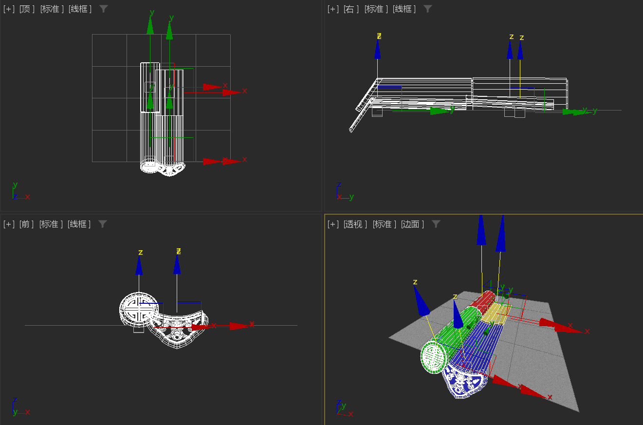 瓦的轴点位置示意图。 红色:筒瓦 黄色:板瓦 绿色:勾头 蓝色:滴水