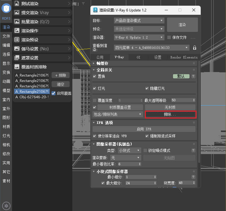 此功能即为 CR VR渲染器中使用覆盖材质渲染的排除功能,RDF将此功能提升为可视化操作。